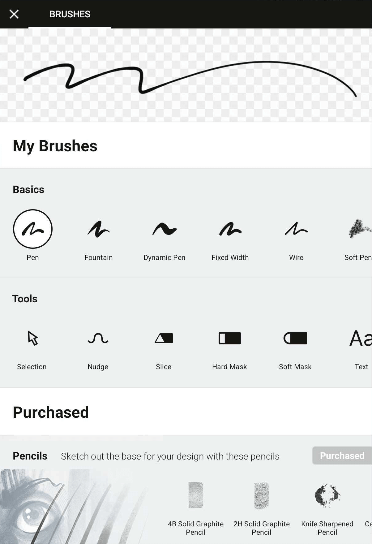 在笔刷菜单中,您可以从基本绘图工具套装或笔刷市场选择一款工具。