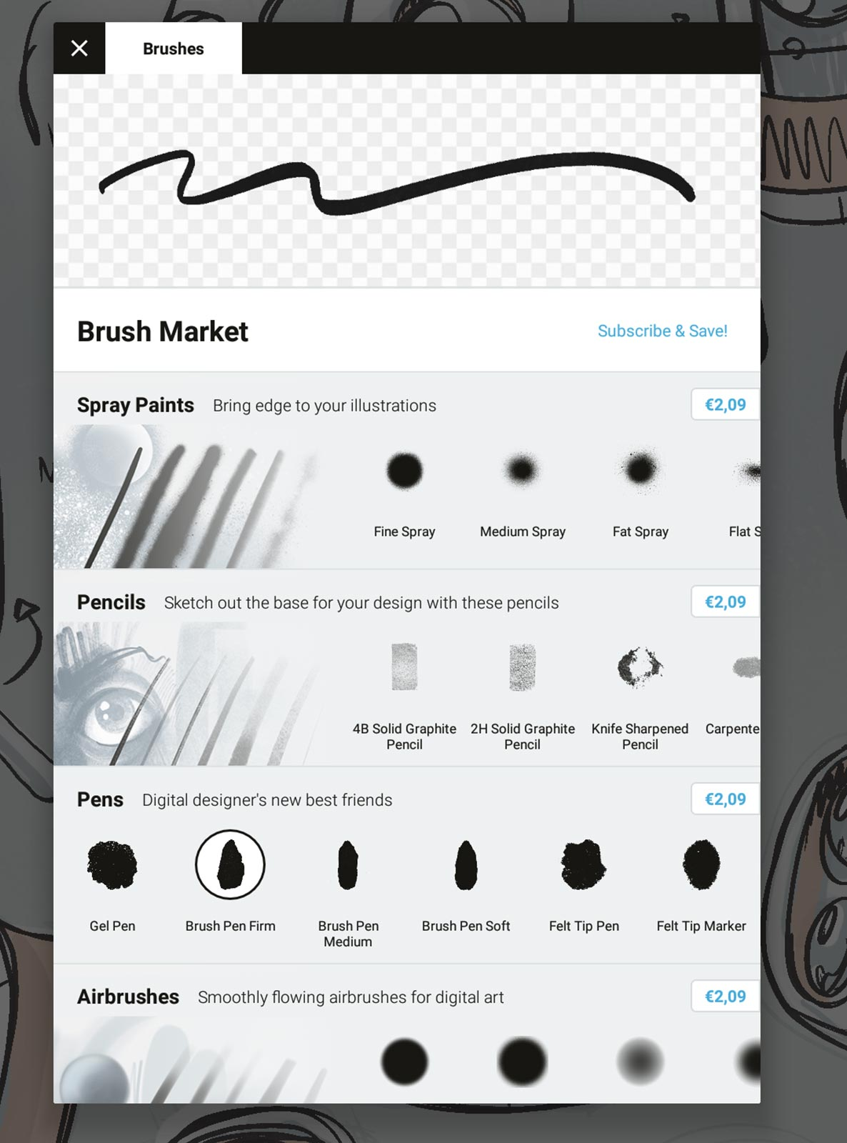 再往下滑,您将看到笔刷市场,里面拥有不同类型的艺术型笔刷包。您可以按需购买,或者订阅以解锁软件的全部功能。